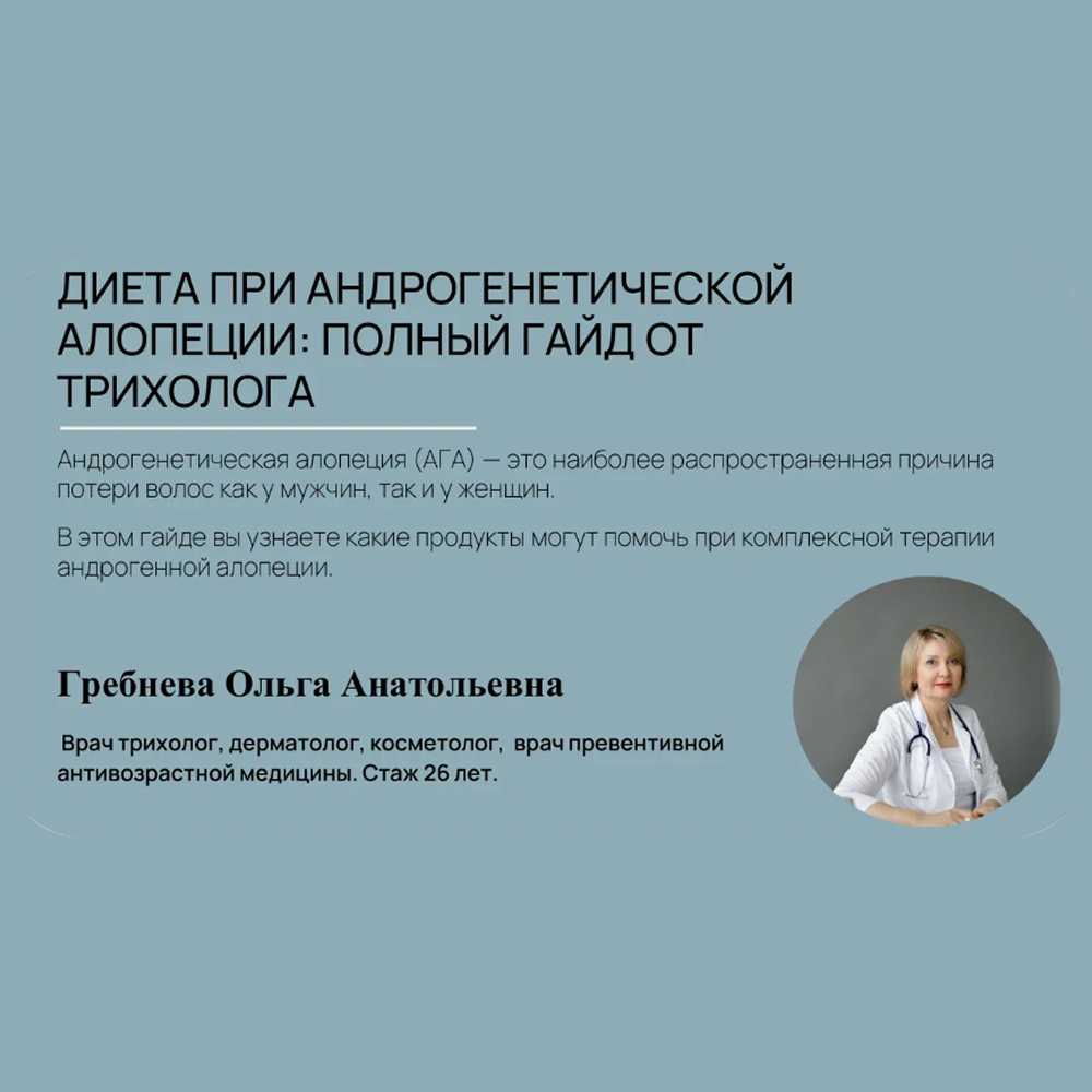 - Теряете волосы из-за андрогенетической алопеции? Знаете ли вы, что правильное питание может стать вашим союзником в борьбе за густоту волос? В этом гайде — вся ключевая информация: - Какие продукты снижают влияние андрогенов на волосяные фолликулы - Что исключить из рациона, чтобы не усугублять проблему - Примерные рецепты для поддержки волос Не просто диета, а стратегия питания против выпадения! Скачивайте гайд и делайте первый шаг к сохранению волос уже сегодня. Ваши волосы скажут вам спасибо!
