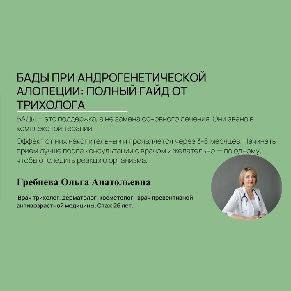 - БАДы при андрогенной алопеции: что действительно работает? Столкнулись с выпадением волос и хотите поддержать их изнутри? В этом гайде вы найдете всю необходимую информацию: - Ключевые БАДы с доказанным действием против андрогенного выпадения - Как работают БАДы - Схемы приема и сочетания с основным лечением Не тратьте деньги наобум — действуйте грамотно! Покупайте гайд и выбирайте добавки с умом. Сильные волосы начинаются с правильной поддержки изнутри.